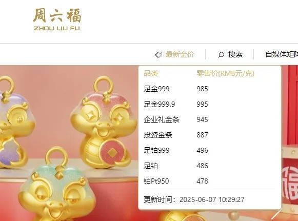 受国际金价走低影响,6 月 7 日国内金饰价格跟跌,部分品牌金饰克价跌破千元大关。其中周六福足金饰品价格为 985 元 / 克,较前一日下跌 15 元 / 克;老庙为 999 元 / 克,较前一日下跌 9 元 / 克。此次金价波动引发市场对黄金投资的关注。