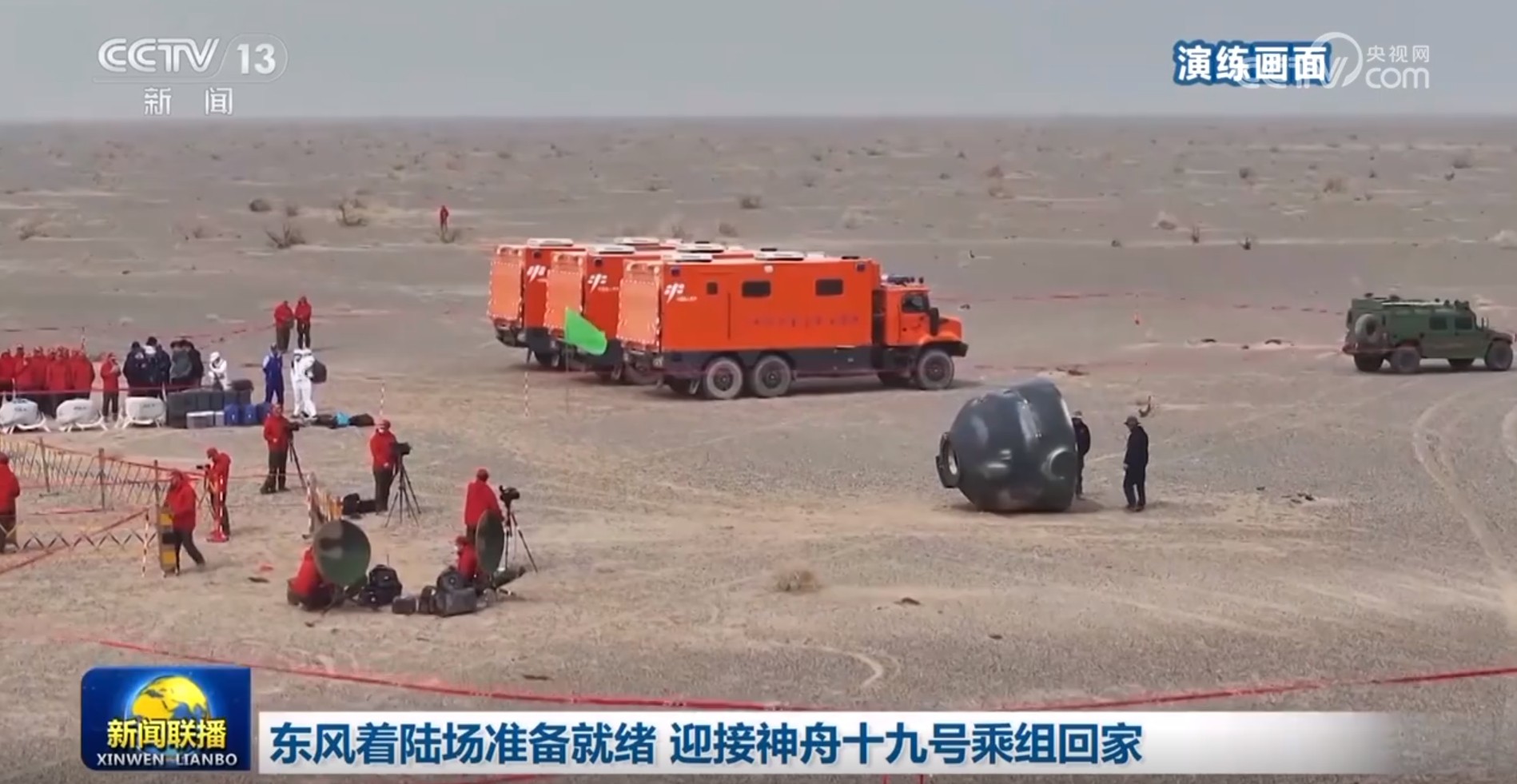 4月25日10时许,地面搜救力量指挥车、搜索车、处置车、医监医救车等近百台车辆装备分多路向待命点集结。14时30分,在接到北京中心通报返回舱落点作标后,空中分队5架直升机精准降落在返回舱周围,按程序进行相关处置。